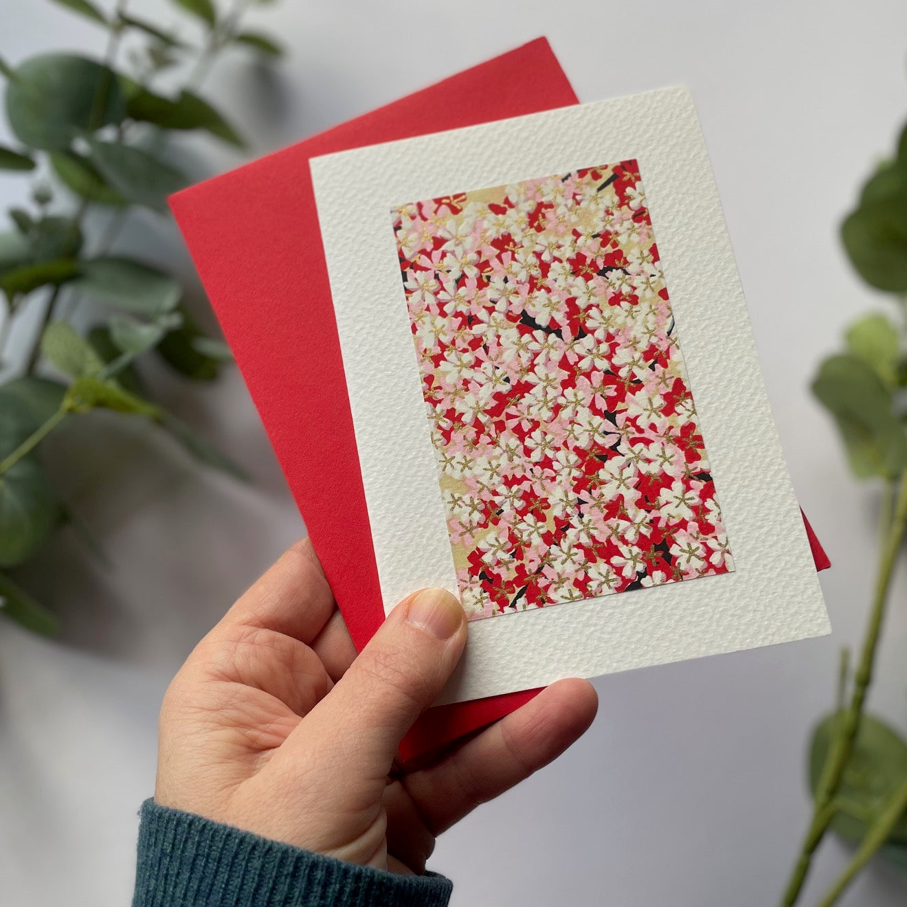 Made from luxurious Fabriano textured card stock, they are embellished with the stunning Chiyogami papers from Japan. These papers are silk screen printed by hand in Japan. This silk screen process is borrowed from the centuries old tradition of printing kimonos. There can be as many as 20 colours on each design, each one printed separately and allowed to dry. It is an intricate, skilful process that gives rise to this beautifully rich and vibrant paper.